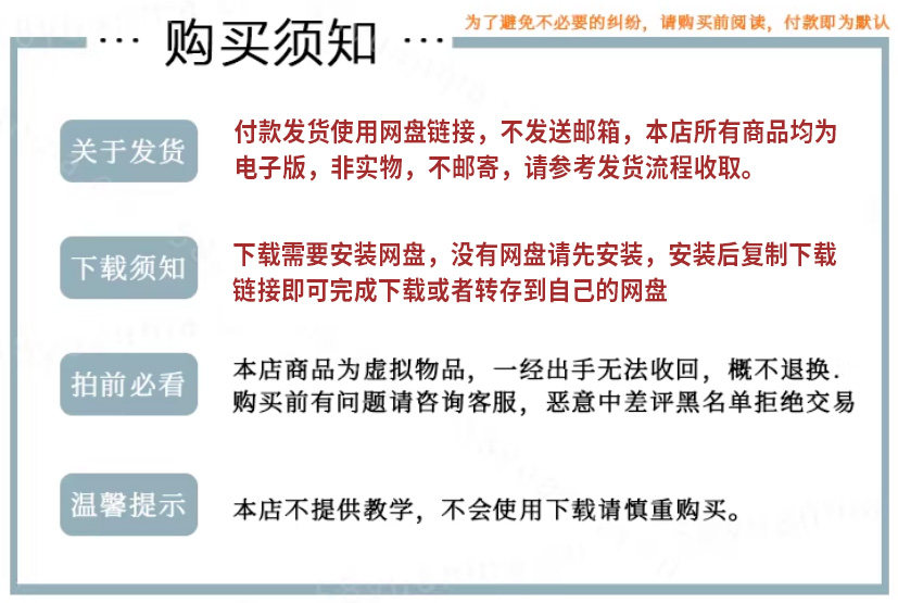 ③ 本站分为百度网盘和夸克网盘下载,使用不了的请不要支付(新疆/西藏/台湾等部分地区IP不支持网盘链接)